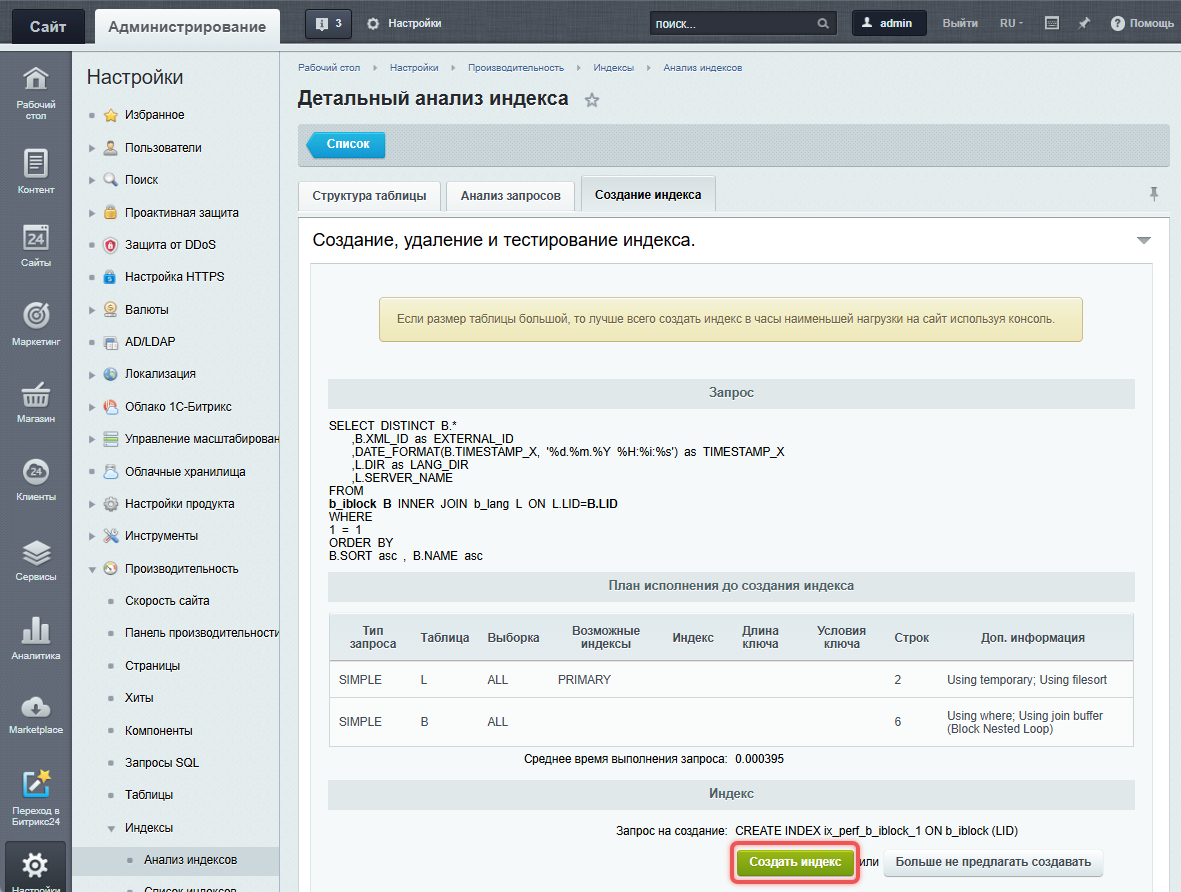 Созданный индекс появится на странице Настройки -> Производительность -> Индексы -> Список индексов