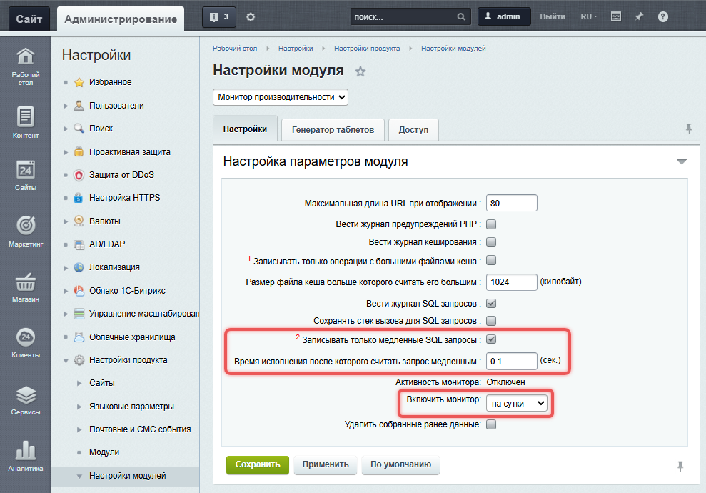 Настройки -> Настройки продукта -> Настройки модулей -> Монитор производительности