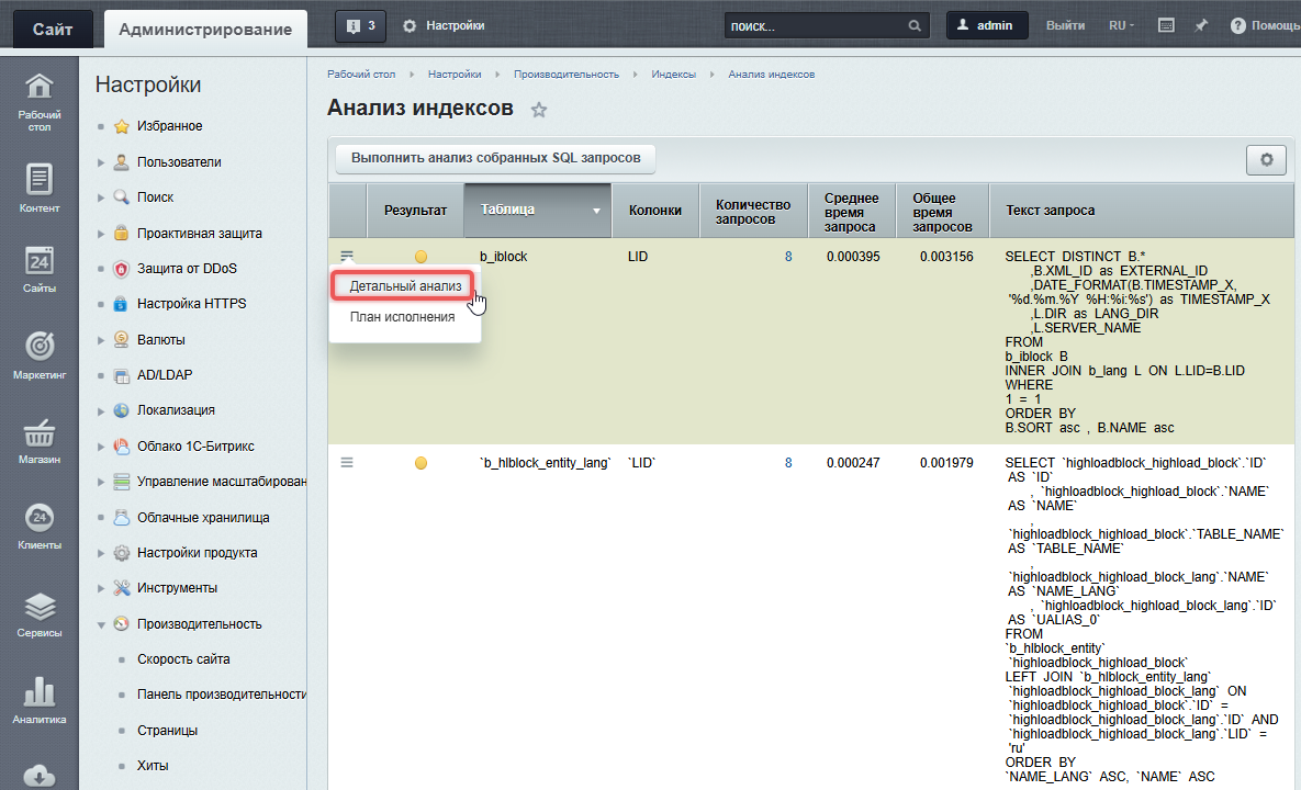 Настройки -> Производительность -> Индексы -> Анализ индексов