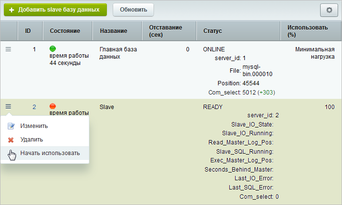 дважды кликните по базе в таблице или выберите пункт Изменить в меню действий. Откроется форма Настройка параметров главной базы/slave базы данных