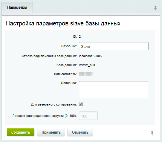 Чтобы изменить настройки подключения базы данных, на странице Настройки -> Веб-кластер -> Группа #1 -> Репликация