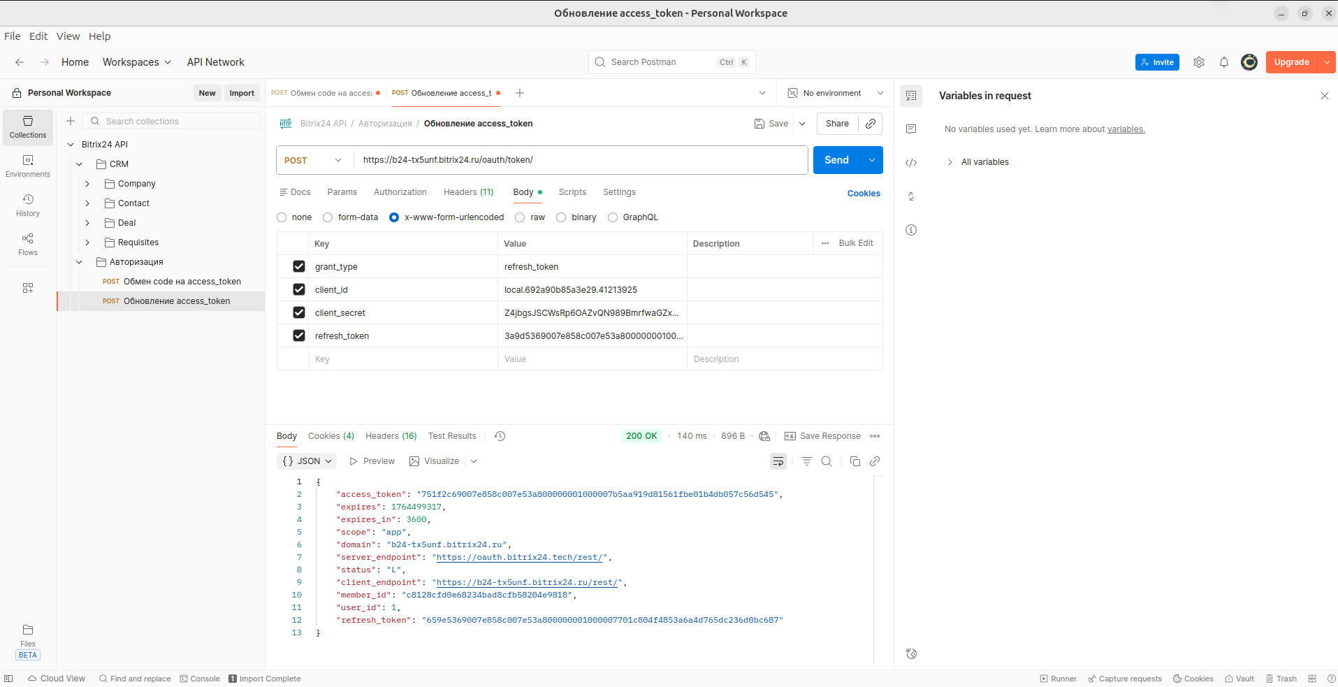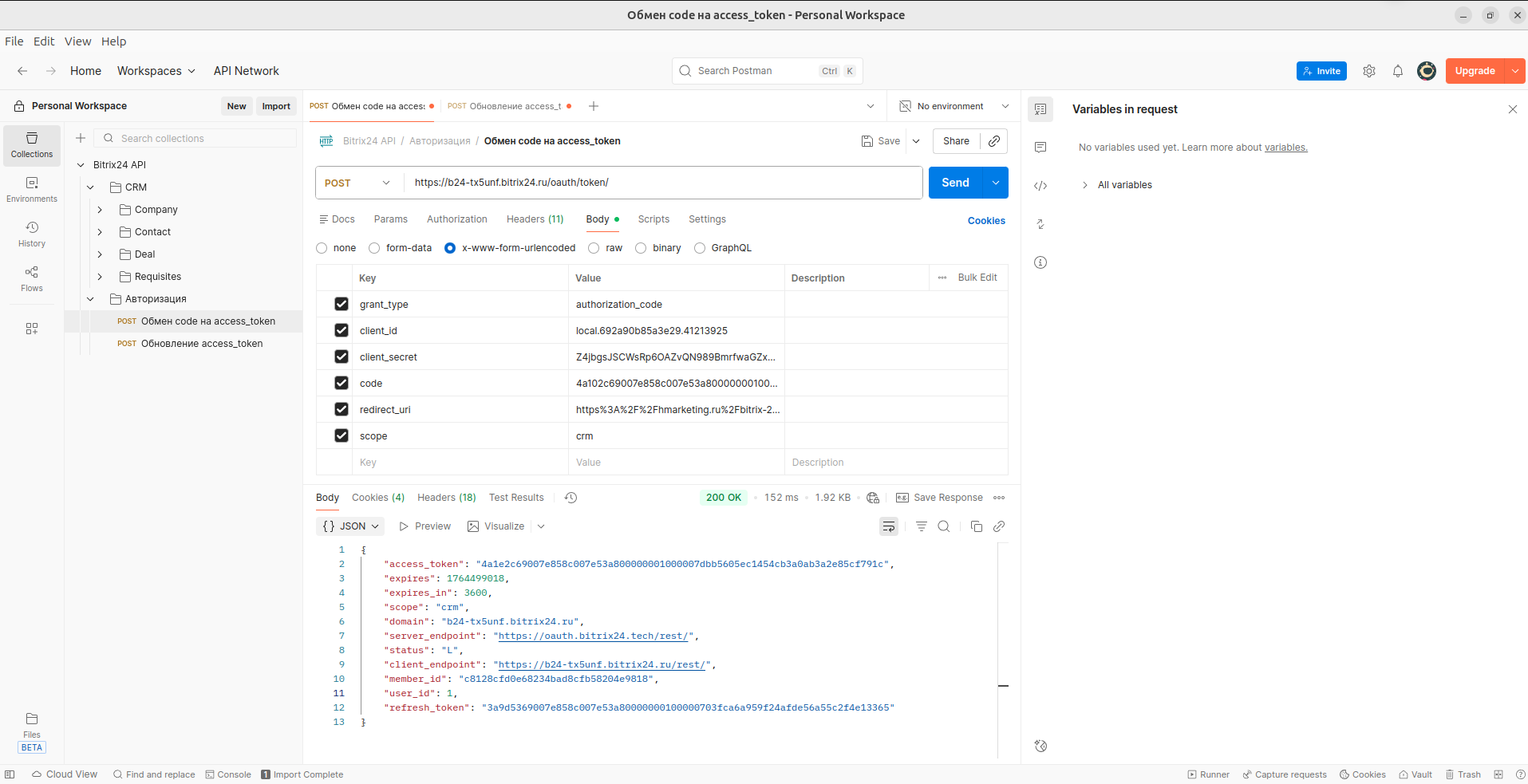 POSThttps://мой_портал.bitrix24.ru/oauth/token/?grant_type=authorization_code&client_id=код_приложения&client_secret=секретный_ключ&code=полученный_code&redirect_uri=http%3A%2F%2Fexample.ru