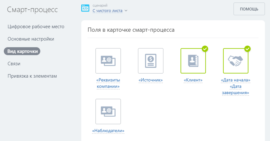 Следующий шаг создания смарт-процесса, это настройка вида карточки. В зависимости от потребностей компании можно добавить одно или несколько предустановленных полей. Например, если фирма закупает товары у внешнего поставщика, то нужно будет кликнуть по кнопкам Клиент и Дата начала (завершения). Собственные поля можно будет добавить уже после создания процесса: