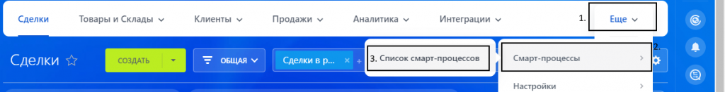 Если монитор обладает большой шириной экрана, выпадающее меню Смарт-процессы будет сразу видимо на панели меню модуля CRM. В противном случае интересующий орган управления будет спрятан под элементом Ещё. После наведения курсора мыши появится строка Смарт-процессы, которая в свою очередь, открывает доступ к пункту Список: