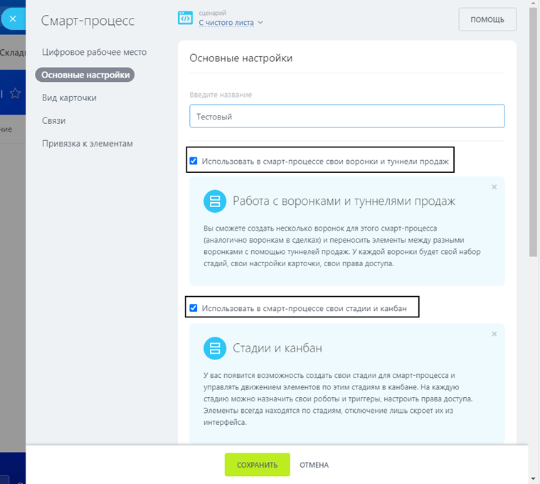 Выбрать какие инструменты будут задействованы в новом процессе. В первую очередь рекомендуется проставить галочку Использовать… свои стадии и канбан. Это позволит наполнить смарт-процесс одним или несколькими специфическими этапами задачи. Кроме того, можно задействовать роботы и триггеры, а также сделать новые воронки в смарт-процессах доступными для всех, если необходимо. Для просмотра и применения дополнительных инструментов нужно пролистать этот список: