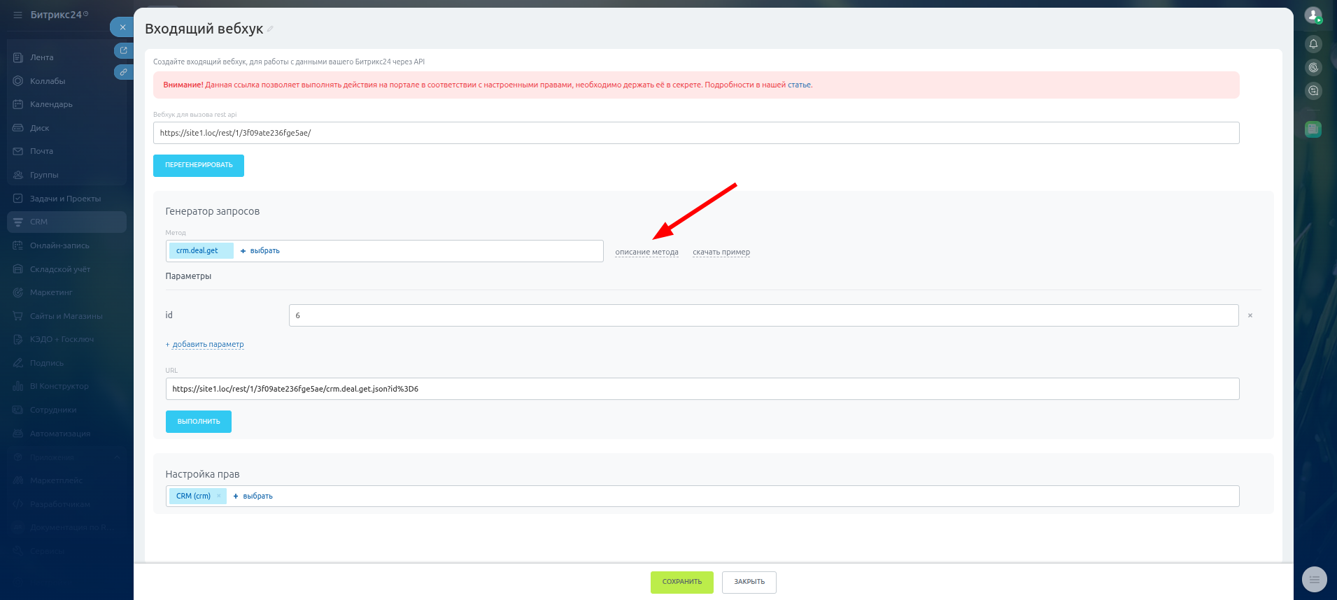 Ниже расположен Генератор запросов, позволяющий сконфигурировать сам вебхук, выбирая нужные значения из выпадающих списков: выбрать метод REST API по расположенным рядом ссылкам доступны подробные описания и примеры и указать права доступа. При необходимости можно добавить дополнительный параметр, нажав на + добавить параметр, все изменения динамически отображаются в ссылке, которая будет использоваться для работы вебхука.