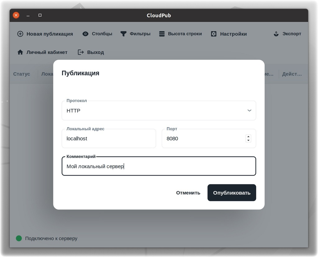 CloudPubCloudPub сгенерирует для вас публичный URL-адрес, который можно использовать для доступа к локальным ресурсам извне. Скопируйте этот URL и поделитесь им с теми, кому вы хотите предоставить доступ.